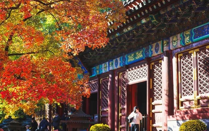 勤政殿:作为公园的标志性建筑,静宜园二十八景之首,殿前栽植“消息树”元宝枫已进入变色中期。橙红的叶片与皇家殿宇彩画、香炉、窗楞相映成趣,尽显古韵秋华,是拍摄建筑与红叶完美结合的经典机位。